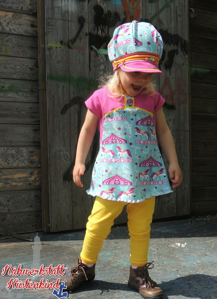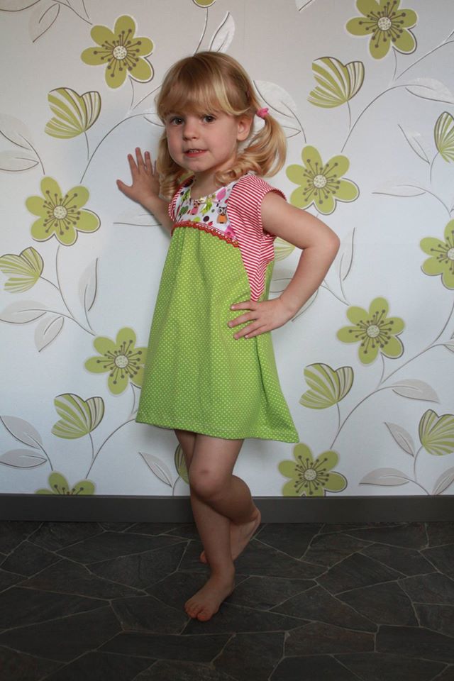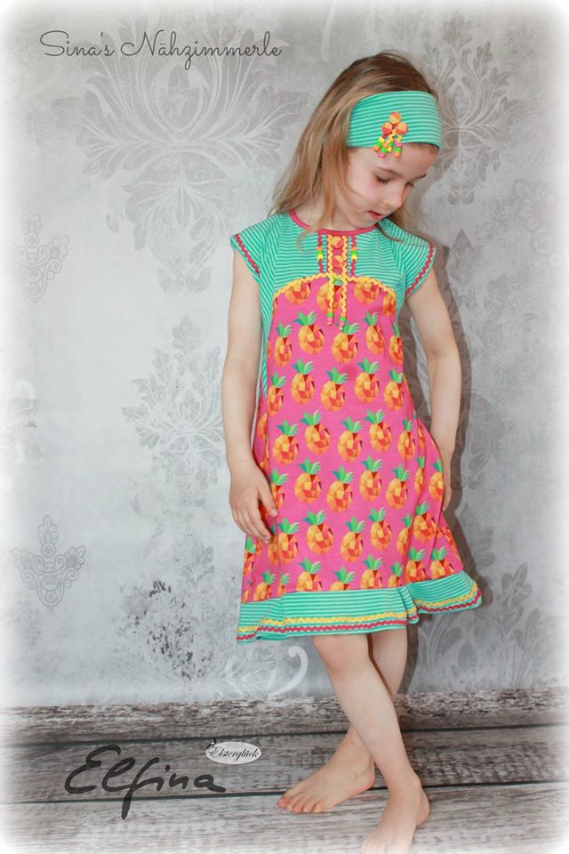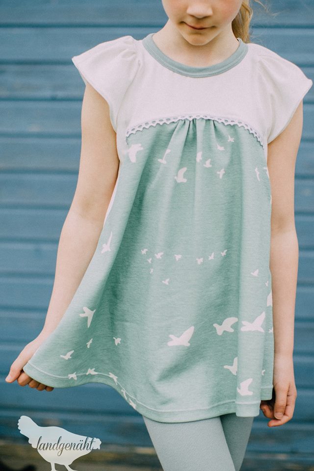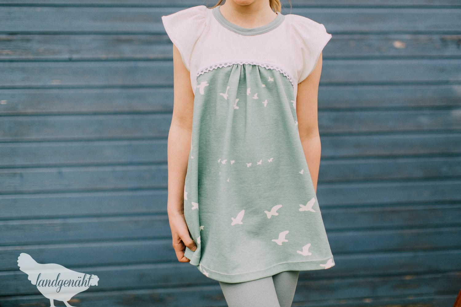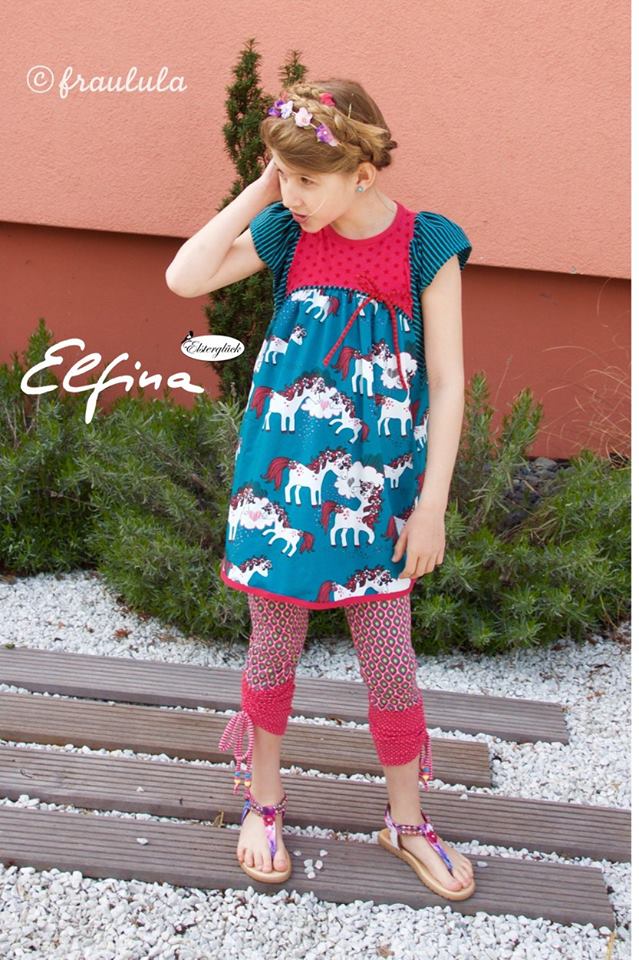 Du kannst ELFINA als Kleid oder als kurzes Tunika-Shirt nähen. Der Schnitt ermöglicht etliche Variationen. So kannst Du Deine ELFINA mit gerafften Flatterärmelchen (Volantärmeln) oder mit normalen Ärmeln, mit gerafftem oder einfachem Vorderteil, mit oder ohne Paspeln , mit Teilungsnähten oder aus einem Stück nähen. Alle Elemente können kombiniert werden, so dass sich aus einem Schnitt viele verschiedene Looks kreieren lassen.
